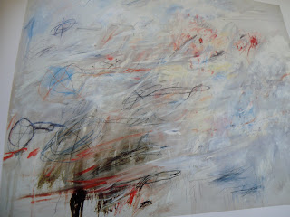 Some people don't much care for what they call Twombly's "doodles." But I think there is real energy here, and lots of bright, open space. I talked to an artist once who said that she thought of white and black as filler, non-essential, round-the-edges kind of colors. White, because it's so opaque, gets bad press, except from people who see it as Twombly does, as more related to a flash of lightning than to a light-blocking curtain. I think white and black are colors in their own right. Maybe we don't see them in nature all that often, as pure colors, but maybe that alone is a reason to appreciate them. Then, too, with a little alertness to black and white, the painting moves, because, as Twombly said, "it doesn't have a center."